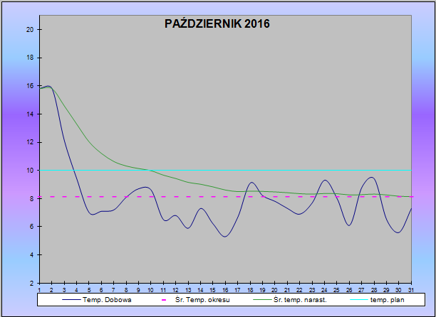 Średnia dobowa temperatura w dniach 1-31 października wyniosła 8,15 oC. W planie techniczno-ekonomicznym Spółki zakładano średnią dobową temperaturę w tym miesiącu na poziomie 10,0 oC. Chłodniejsze noce i poranki sprawiły, że nasi Klienci zużyli więcej energii cieplnej niż założyliśmy w planie techniczno - ekonomicznym Spółki.