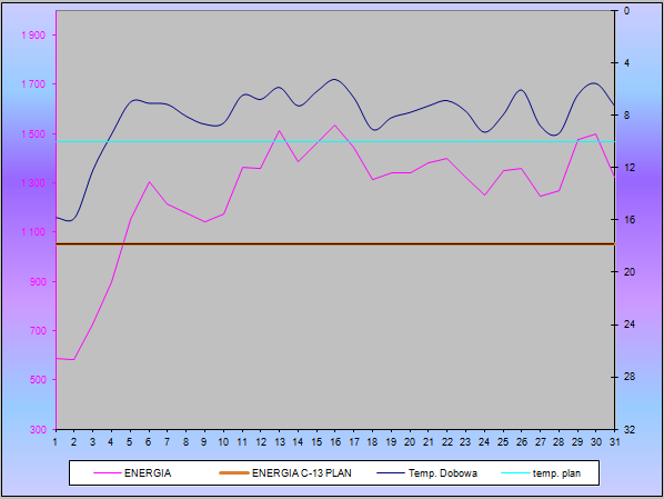 Zmiany produkcji, które odpowiadają zmianom zużycia energii cieplnej w październiku przedstawiono na powyższym wykresie (PEC w Gnieźnie, dzięki zautomatyzowaniu i opomiarowaniu procesu produkcji, dostarczania i dystrybucji energii cieplnej, dostarcza tylko tyle energii jaka jest pożądana przez użytkowników).